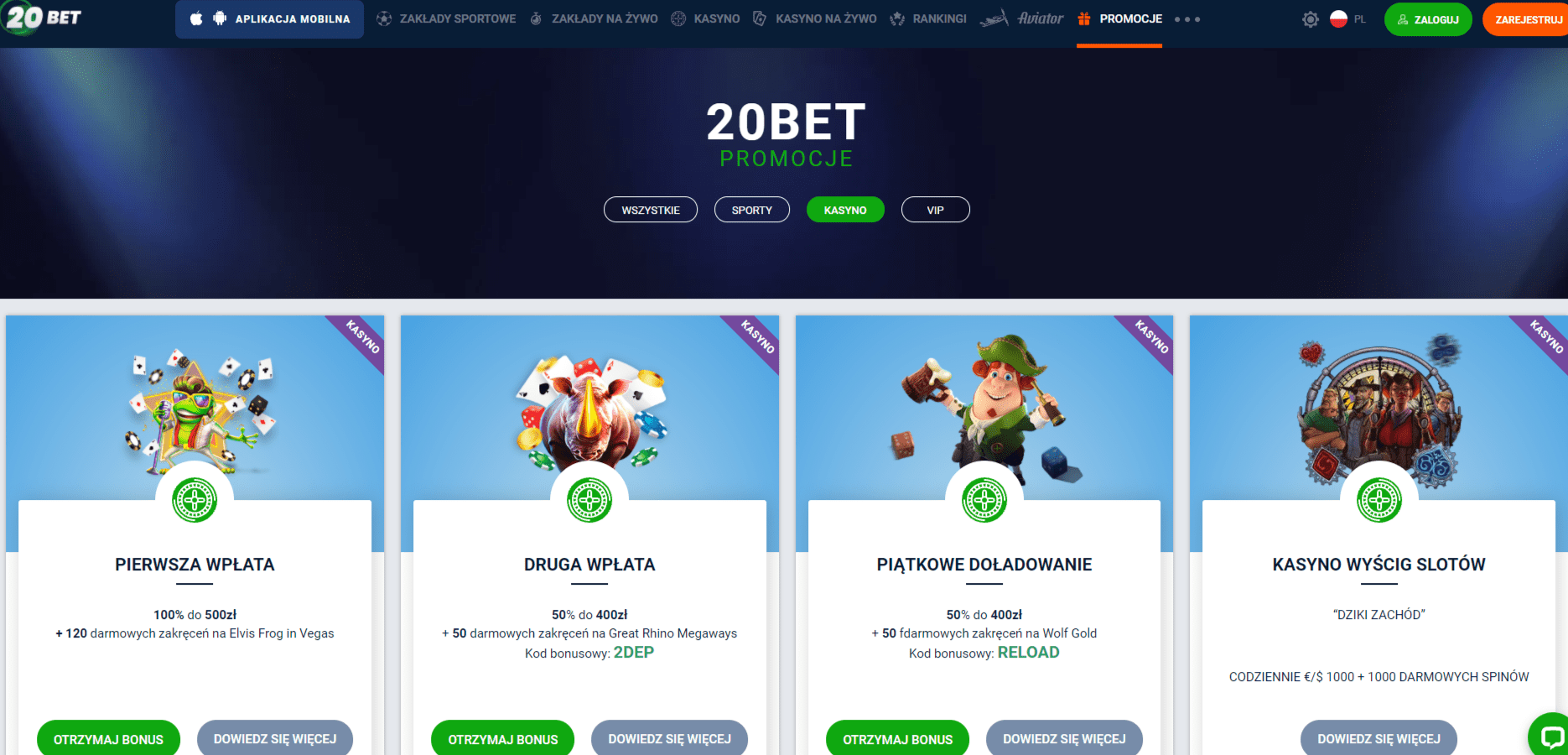 20 Bet to rozbudowana strona, na którą składają się zakłady bukmacherskie, kasyno online oraz kasyno live. Nie ma więc możliwości, abyś nie znalazł na niej tego, czego szukasz. Kasyna online i na żywo są dobrze zaopatrzone, dzięki umowom z dużymi i cenionymi producentami gier. Co więcej, 20 Bet oferuje także system bonusów, z których możesz skorzystać zarówno jako gracz początkujący, jak i doświadczony.