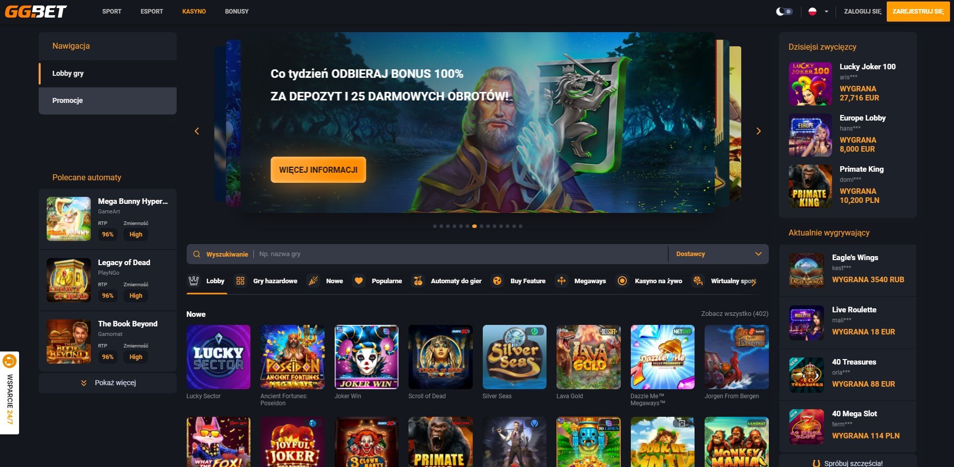 | Sloty | W ofercie GG Bet znajduje się ponad 800 automatów online | Egypt Goods, Divine Fortune, Big Bad Wolf |